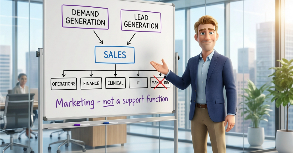 When marketing reports to sales and gets leftover budget, you get support-level results. In healthcare's new reality, that's a commercial strategy problem — not a marketing problem.